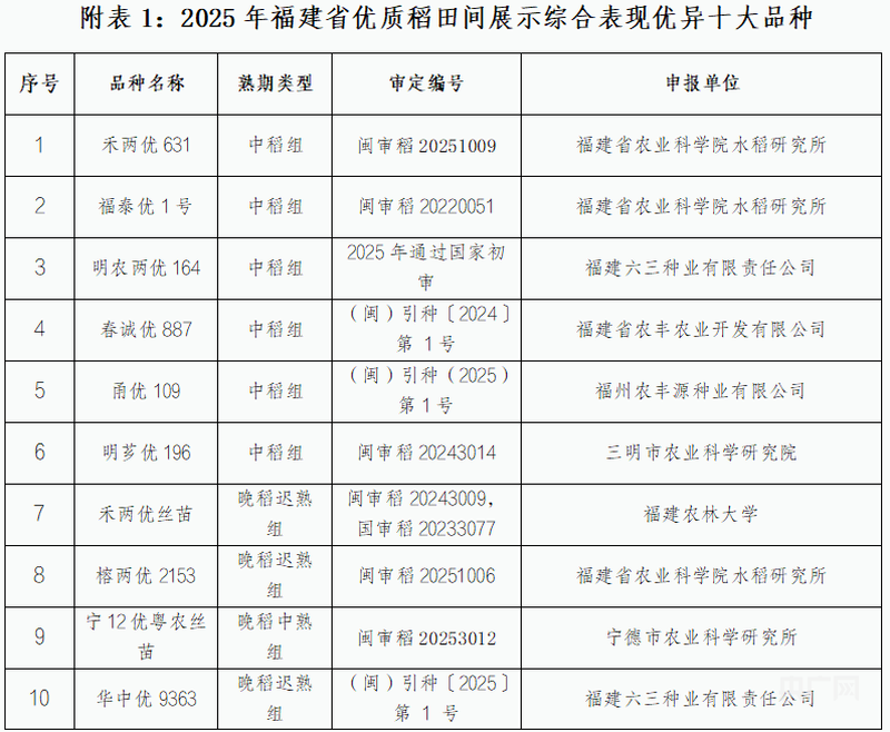 2025年福建省优质稻田间展示综合表现优异十大品种(排名不分先后)(央广网发 福建省种子总站供图)