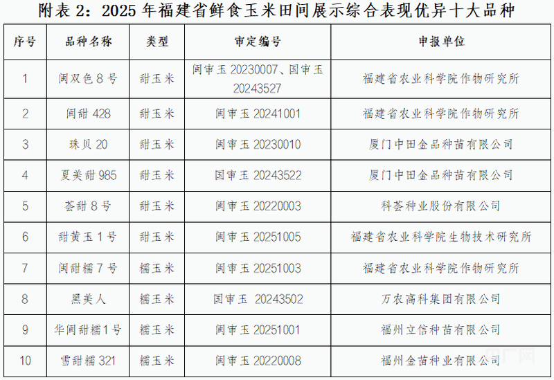 2025年福建省鲜食玉米田间展示综合表现优异十大品种(排名不分先后)(央广网发 福建省种子总站供图)