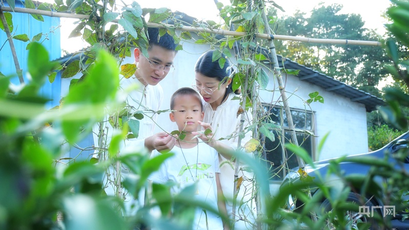 汤小廷(左一)、林美金(右一)和孩子在茶山上体验摘菜野趣(央广网记者 龚雯 摄)