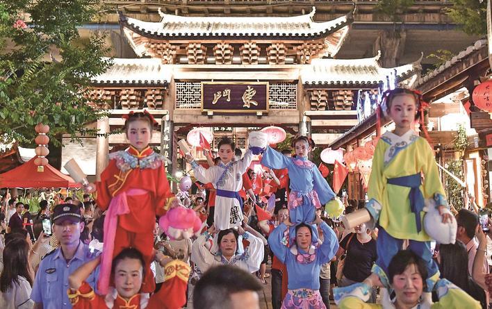 10月1日傍晚,沙县东门古街举办“肩上好戏游东门 锦绣虬城贺华诞”非遗展演踩街活动,肩膀戏、社火等轮番上阵,市民游客共庆新中国76周年华诞。(全媒体记者 林文斌 陈登达 摄影报道)