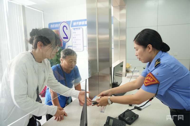 福州站客运值班员赵静(右)正在解答旅客疑问(央广网记者 龚雯 摄)