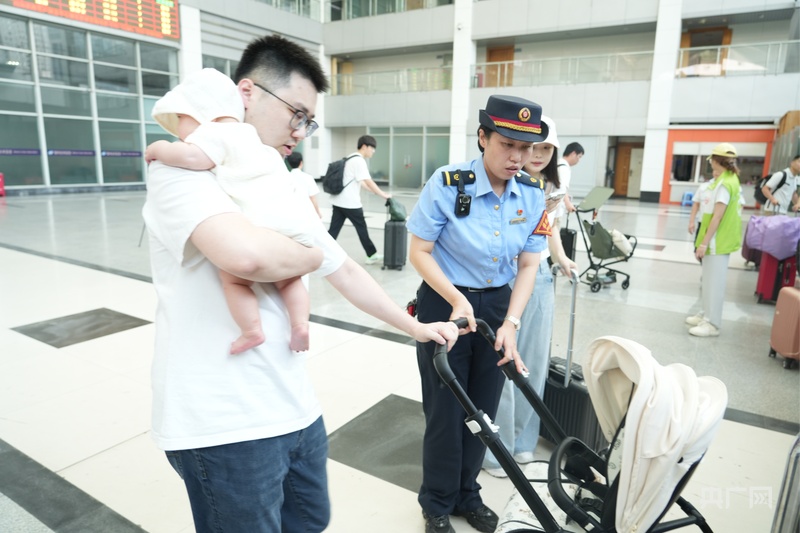 11时25分,赵静刚在服务台解答完旅客的换乘疑问,就看到广场上有对年轻夫妇在焦急地讨论着什么。丈夫李哲一手拎着行李箱,一手抱着发烧的孩子,妻子推着婴儿车,背包拉链还敞开着,纸尿裤和玩具散落在地上。“孩子发烧了,我们还没进站,怕赶不上车,正想着要不要改签后面的车。”李哲看到客运值班员前来,燃起希望的同时松了口气。
