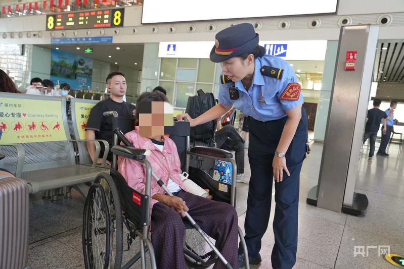 10时许,福州站候车大厅的广播刚播报完G5316次列车检票通知,正在进行巡视服务的赵静就听到呼喊声——“同志,前面有位旅客需要帮助。”赵静穿过密集人流,快步走向第三候车区,看到一名拄着拐杖的老人正攥紧车票,显得十分着急。