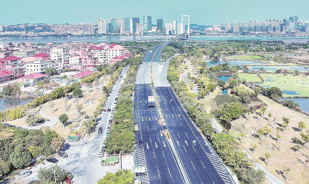 作为省级重点工程,晋新路快捷化改造项目起于六源路(北接晋江大桥),终于西滨镇军垦农场,路线全长约8.74千米。改造后,3024米长的主线高架桥跨越多条河流与交通要道,形成立体交通网络;双向四车道的辅道与主线分离,既保障过境车辆高速通行,又满足沿线居民日常出行需求。(通讯员 董严军 记者 肖蔚男 摄)