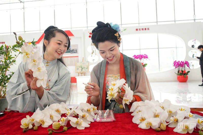 游客体验手绘蝴蝶兰鲜切花(央广网记者 龚雯 摄)