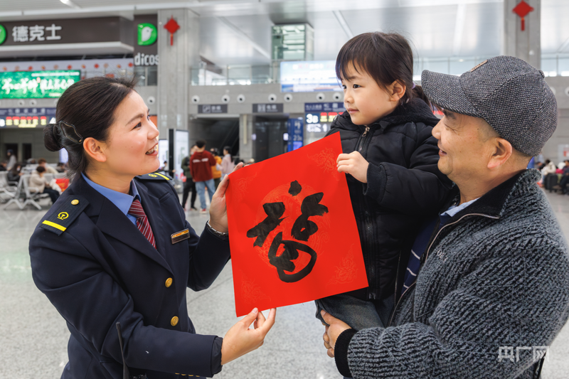 龙岩站工作人员给旅客送福字(央广网记者 罗晓英 摄)