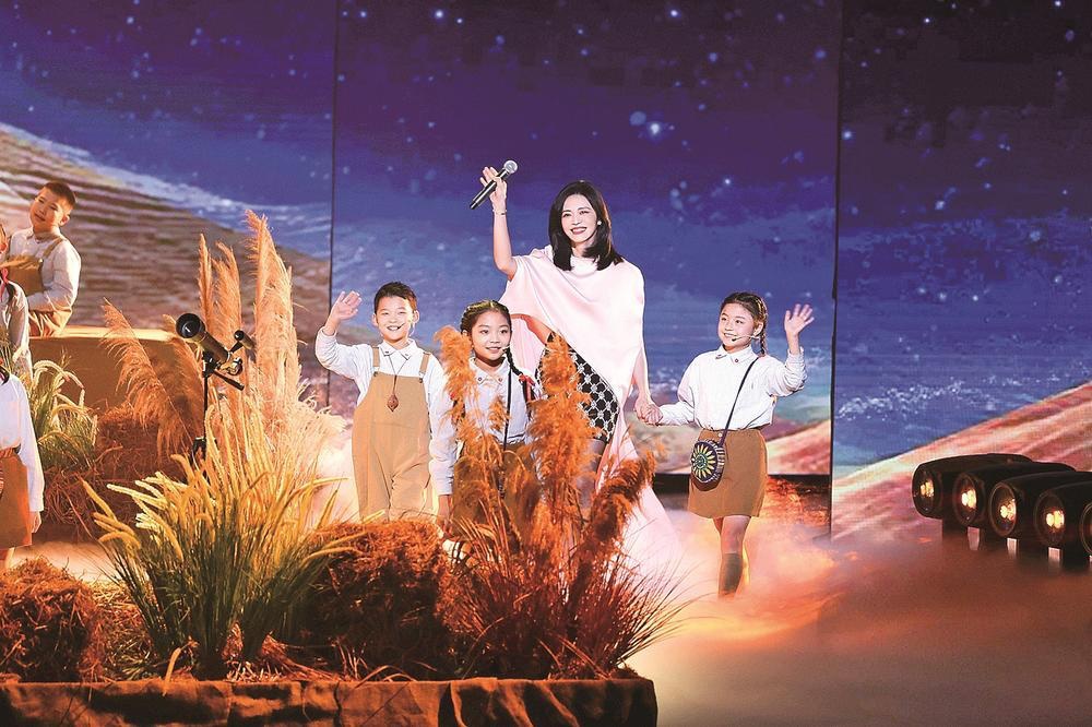 来自宁夏银川市闽宁第一小学山海情合唱团的孩子们与福建籍演员姚晨共同演绎歌曲《宁夏》。