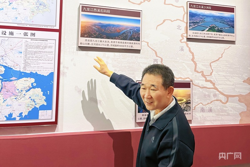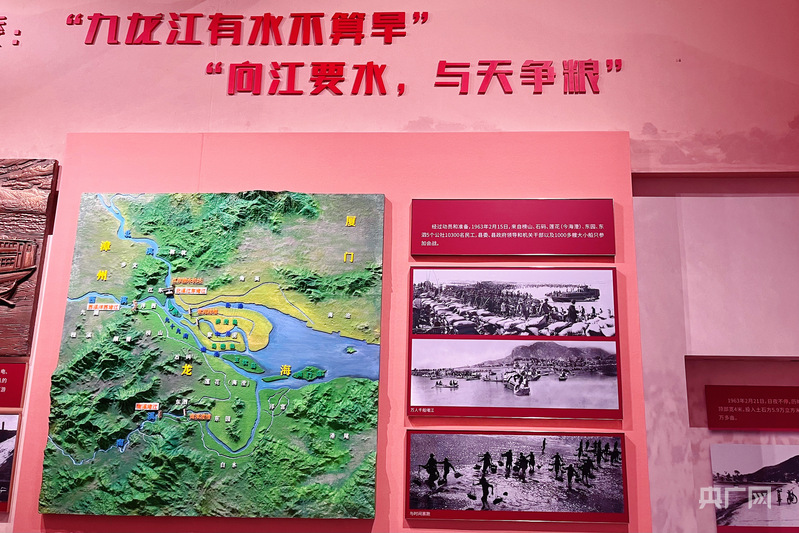 九龙江1963年堵江截流的示意图和现场照片(央广网记者 龚雯 摄)