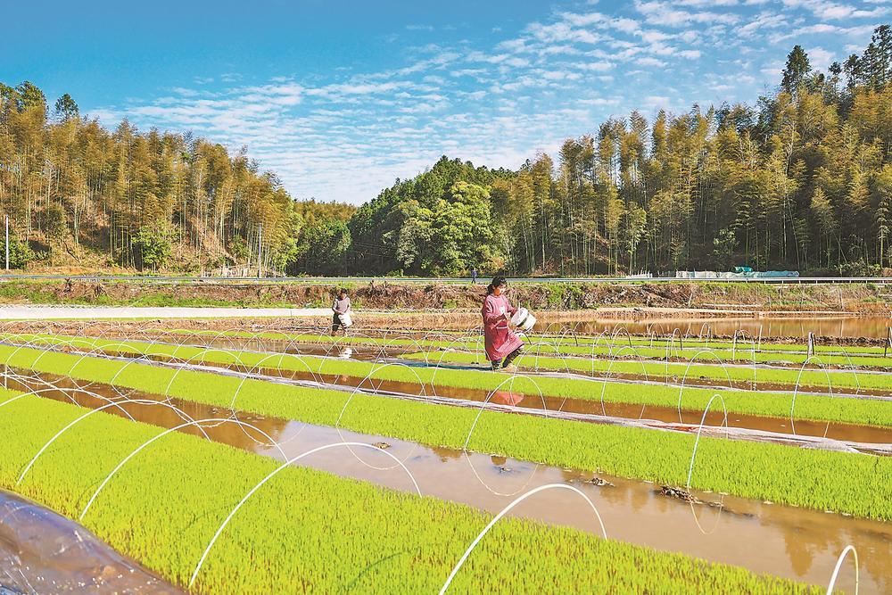4月1日,在建宁县溪口镇枫元村高标准制种基地,农户趁着晴好天气为早制母本秧苗施肥。近年来,当地推广育秧盘育秧,育秧效率大幅提升,传统一亩秧地仅能供应12至15亩大田,育秧盘育秧可供应80亩大田且秧苗规整健壮,适配机械化插秧(陈震 庄紫怡 摄)