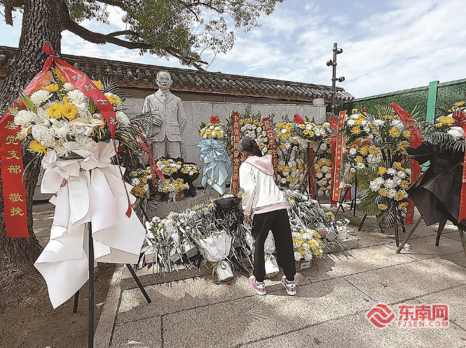2日,在福州市仓山区螺洲古镇吴石故居,一名女孩在吴石将军雕像前献花,寄托哀思(福建日报记者 张文奎 摄)