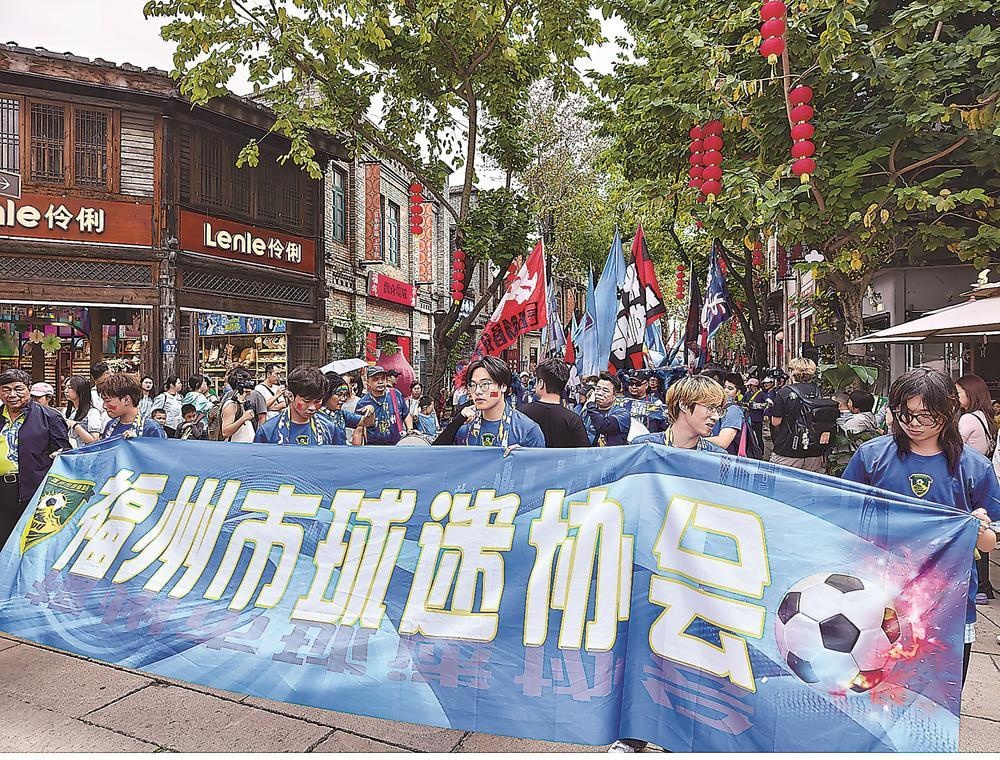 4月11日,“闽超”福州队球迷在福州市上下杭历史文化街区开展球迷助威活动(魏培全 摄)