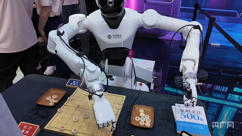 现场体验区内,一台机器人正与观众下棋(央广网发 张语欣 摄)