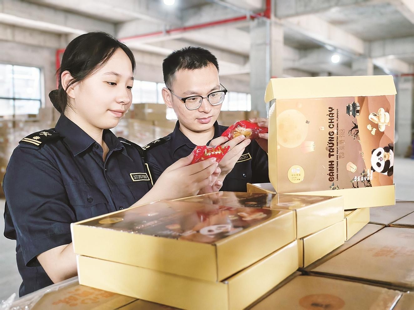 漳州海关关员对出口苏式月饼进行监管(张小勤 摄)