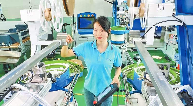 连日来,龙岩市富鑫达电子制造有限公司生产车间内,工人正在自动化生产线上检测产品。今年以来,该公司已投入资金1600多万元用于购置自动化生产线,用于专业线束加工和连接器设计制造。截至目前,已新增设备20余台,生产效率大幅提升,企业今年产值有望提高20%,突破8500万元。(通讯员 熊川 摄)