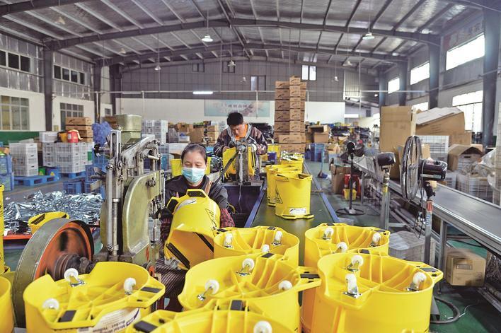 尤溪景竹家居主要生产竹棍、拖把杆、晾衣架等传统竹制品,出口至日本、澳大利亚和欧美、东南亚等全球60多个国家和地区。仅拖把桶套装,年销量达40万套。景竹家居坚持春节假期连续生产,预计今年一季度出口额可超200万美元。图为春节期间,员工在拖把桶生产线上赶制海外订单。(尤溪记者站 吴振湖 摄)
