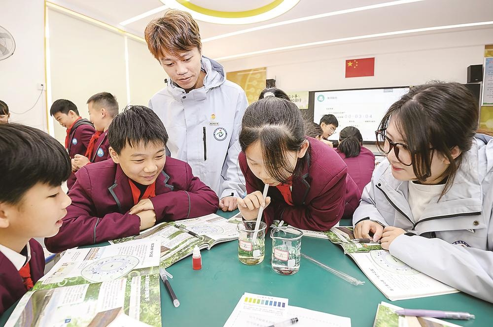1月20日,福建师范大学东侨实验小学内,来自福建师范大学协和学院的大学生寒假社会实践队队员加入小学生的课堂,共同体验由宁德时代开发的“零碳”特色校本课程。