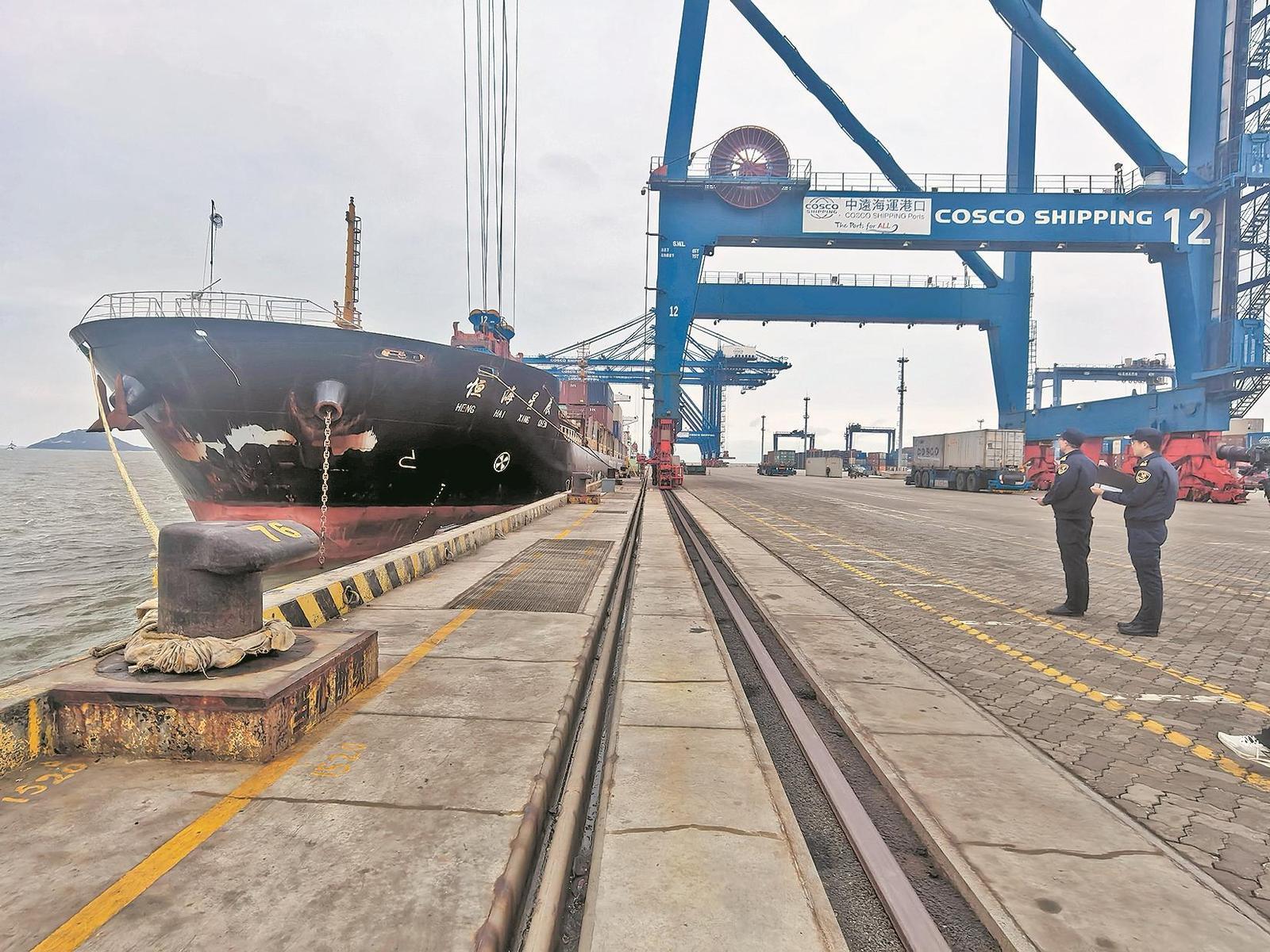 泉州海关关员在石湖港区对集装箱船舶进行巡查(黄忠族 摄)