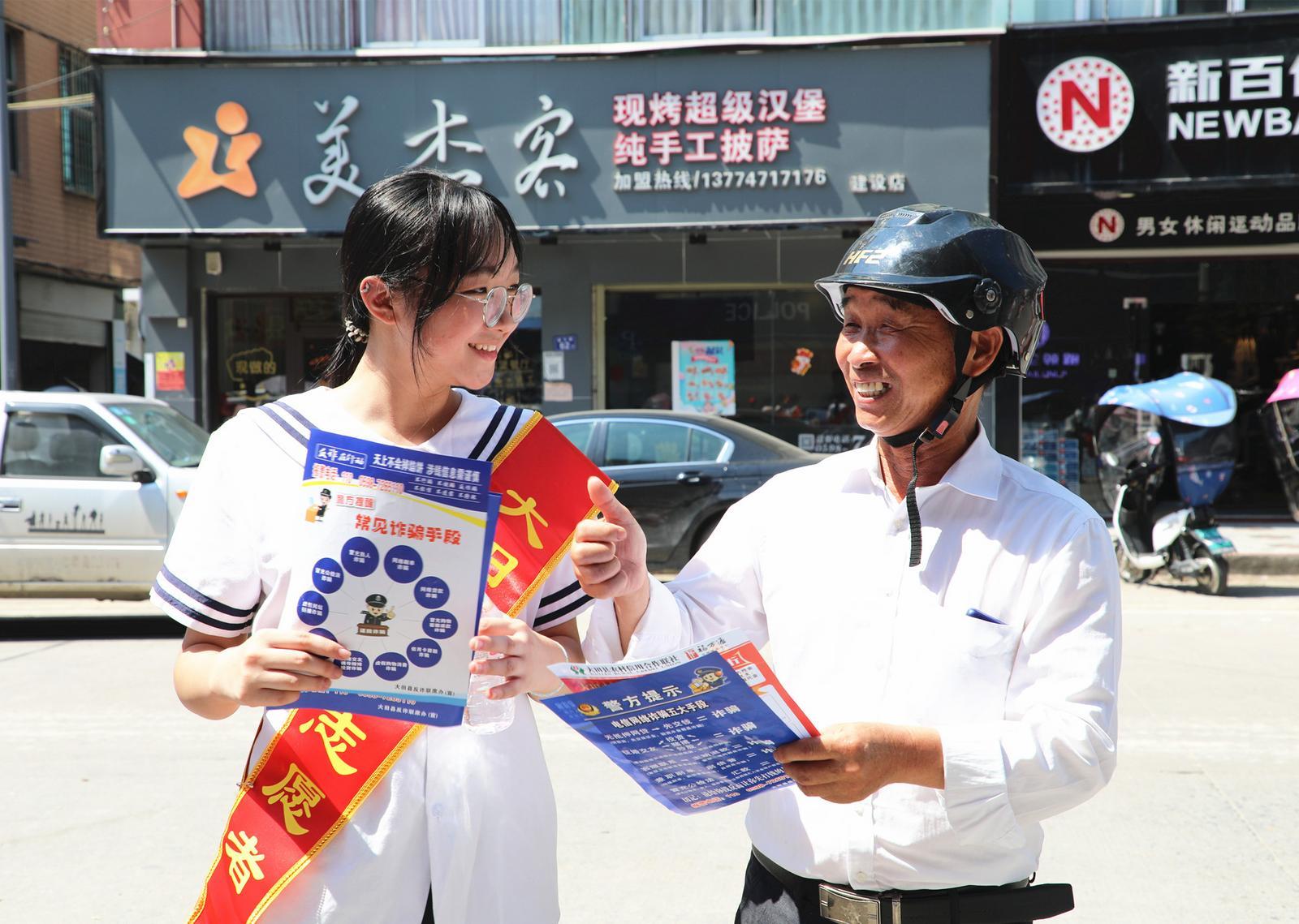大田一中“青年志愿者”将普法宣传手册递到群众手中