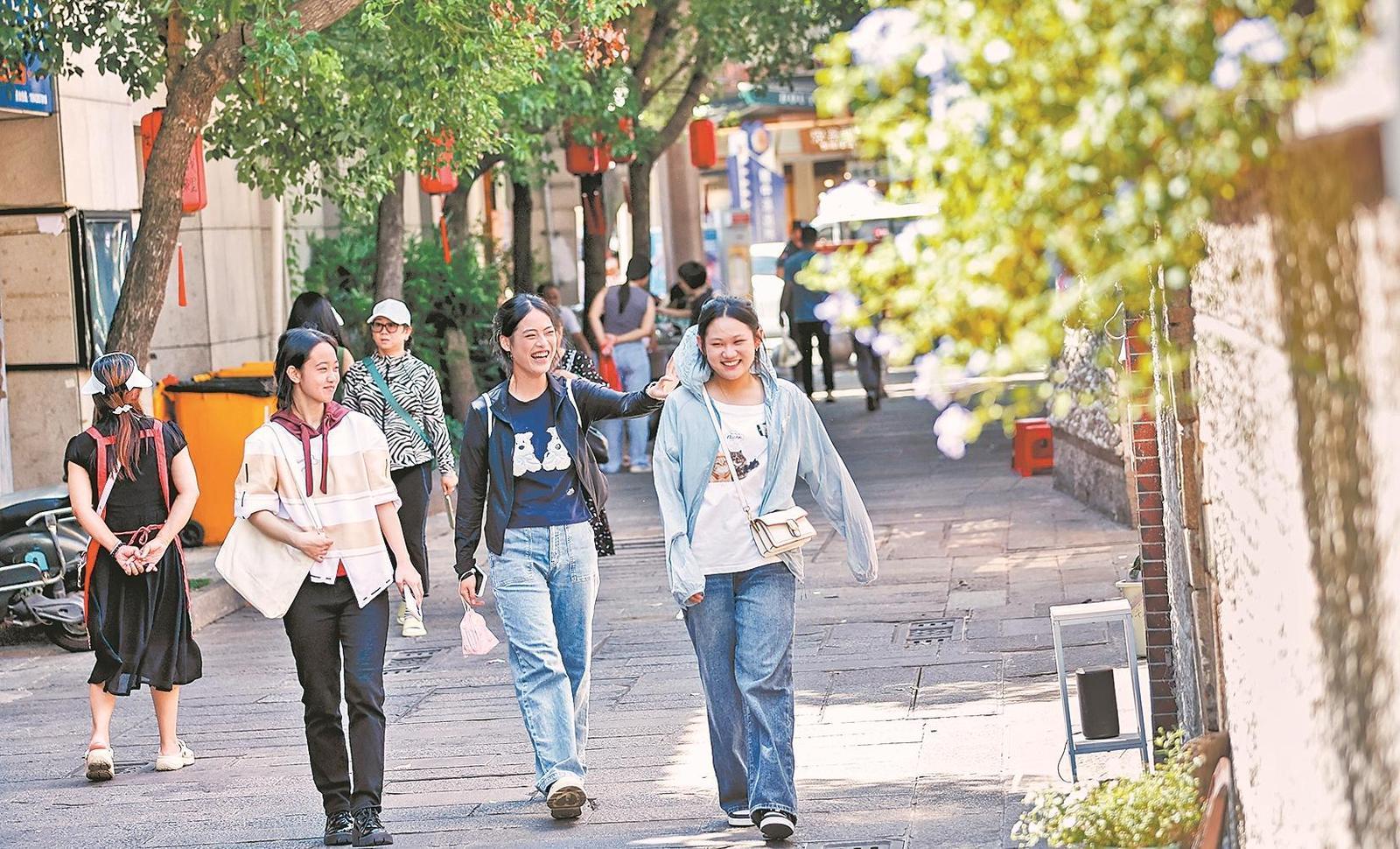 国庆长假期间,除了在世遗景点感受古城文化底蕴,不少游客选择穿梭于纵横交错的巷弄间,或跟随公益讲解员的脚步聆听历史回响,或跟着播客打卡古城遗迹,或在文创小店与咖啡馆中消磨时光。他们在慢节奏中,感知着藏匿于古城街巷中的文化脉动和市井气息。