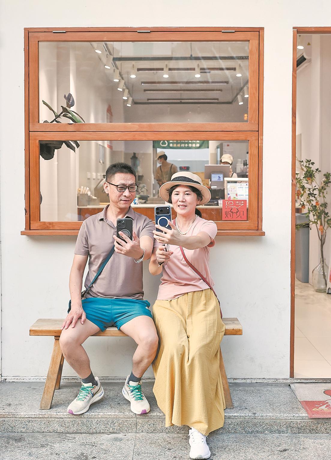 湖北的陈先生携妻子在花巷的小店前拍照留念(林劲峰 摄)