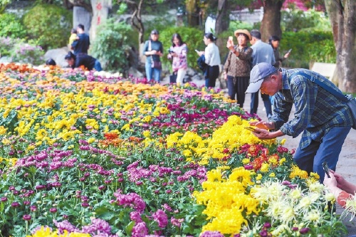 西湖菊展还在布置中,就已吸引众多市民前来观赏(记者 包华 摄)
