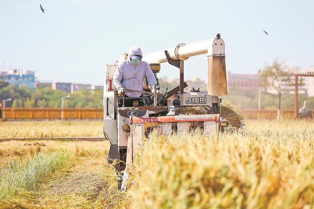 9日,石狮市晚稻收割拉开序幕。在石狮市湿地公园内,稻田铺就金色画卷,稻浪翻滚。农户驾驶着收割机穿梭其间,娴熟地开展收割作业。(通讯员 颜华杰 摄)