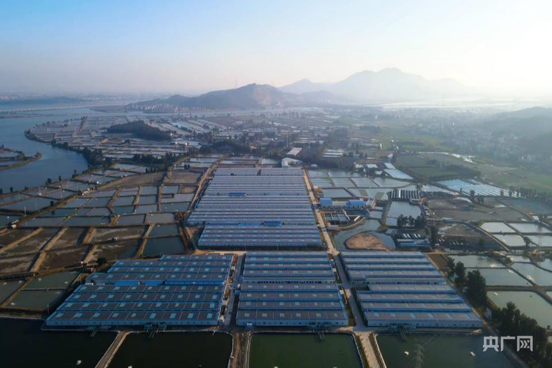 “渔光一体”的生态养殖基地,棚顶光伏板将阳光转化为清洁能源(央广网发 周巍 摄)