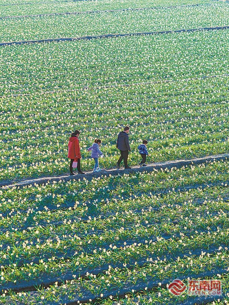 10日,市民游客在位于漳州高新区的水仙花海游玩。漳州是水仙花之乡,拥有全国最大的水仙花栽培生产基地,其总产量和市场占有率均占全国的97%以上。漳州高新区水仙花海连片规模近3600亩,每年冬季,花海中的水仙花连片盛放,勾勒出一幅美丽的生态画卷。(福建日报通讯员 张旭)