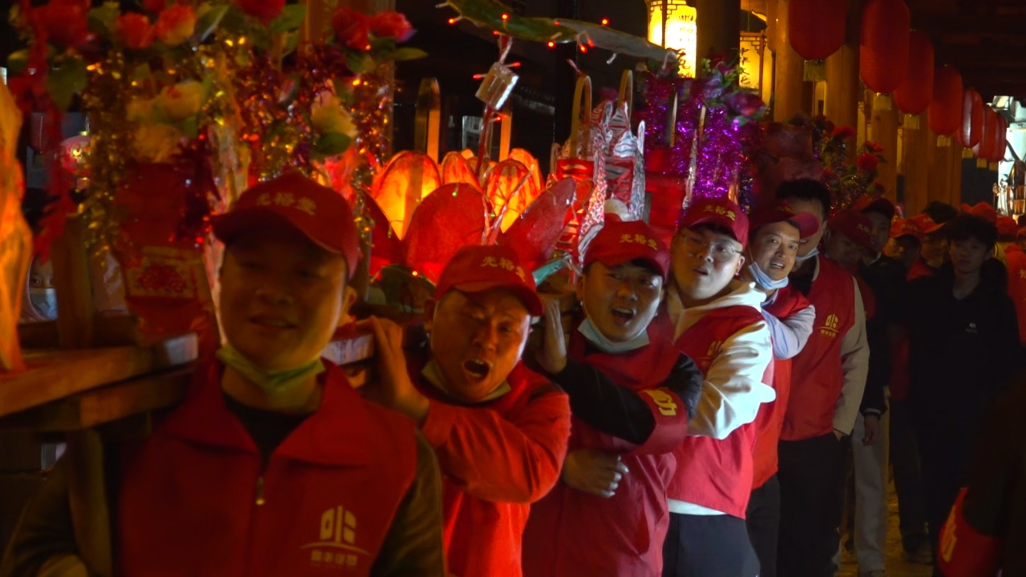 村民们抬举着花灯长龙,在乡村巷道蜿蜒前行,时而悠然游弋,时而拔足狂奔,时而前挤后拉,龙身在剧烈的角力中蜿蜒扭动,惊险刺激的场面引得围观者阵阵惊呼。