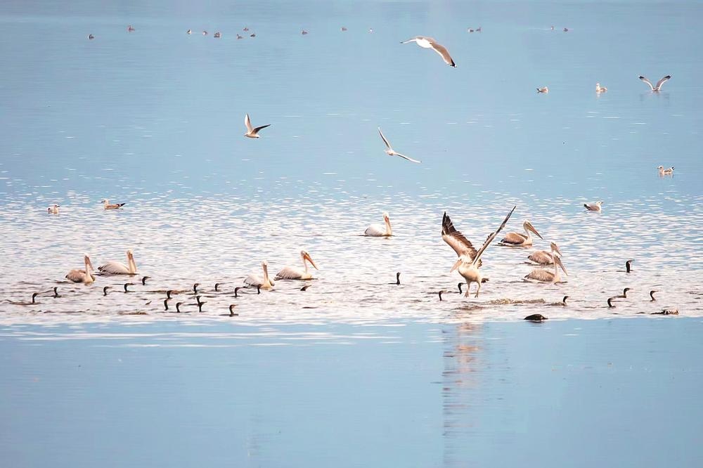 近日,福州罗源湾来了一群国家一级保护鸟类卷羽鹈鹕,吸引不少观鸟爱好者前往拍摄。据罗源县自然资源和规划局野生动植物管理站负责人游永喜介绍,罗源湾海域鱼类资源丰富,为鸟类提供了充足的食物,并且当地持续多年开展爱鸟护鸟、生态保护工作,成为候鸟迁徙路线上的重要“驿站”。(倪炎通 陈欢欢 摄)