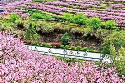 骑行队伍穿行于桃花掩映的穆云南山公路间(李郁 摄)