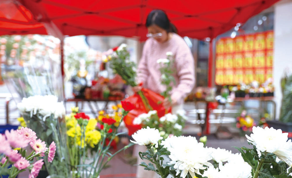 又是一年清明时,一束鲜花忆故人。白菊花、黄菊花、白百合……昨日(4月4日),在晋江梅岭综合市场,部分摊主将各种花色做成的花束、花篮摆在显眼位置,市民正在挑选花篮。摊主告诉记者,随着“绿色祭扫、文明祭祀”观念深入人心,鲜花祭祀成为当下主流;每年清明前后,花束和花篮销量都很好。(记者 陈巧玲 摄)
