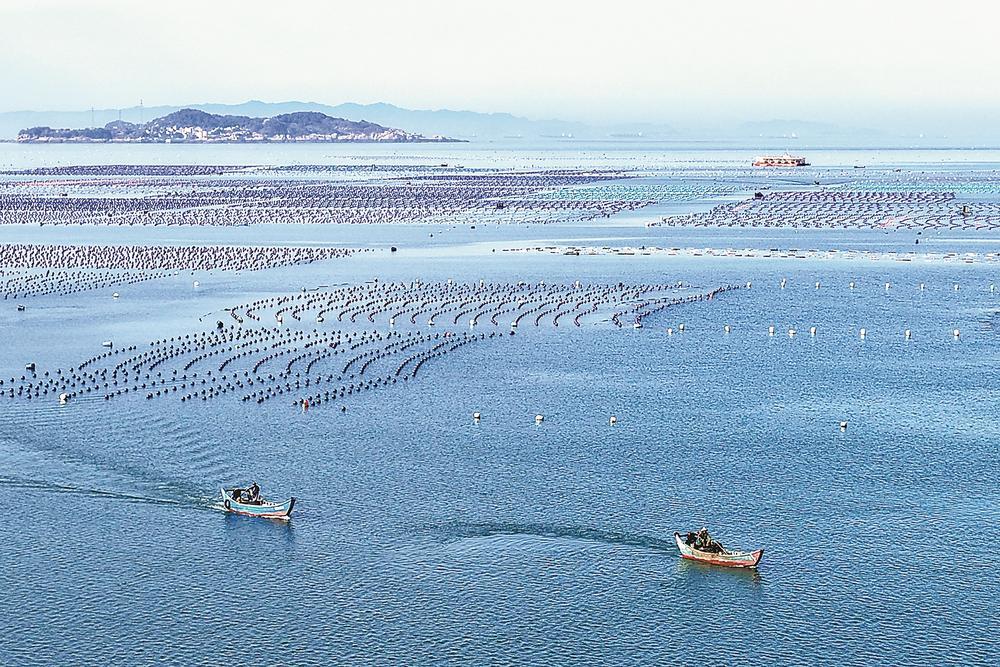 近日,福州市连江县赤才村海域海洋牧场养殖区一派繁忙。养殖工人驾驶渔船穿梭在生态养殖浮筏之间,有序开展投饵、管护、巡查等海上生产作业。