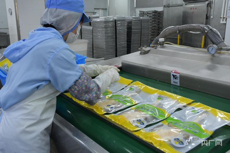 生产线上,工人正在包装大黄鱼精深加工产品(央广网发 张语欣 摄)