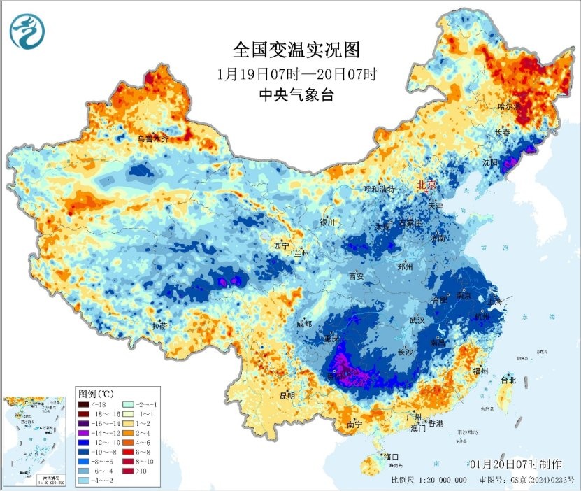 20日早晨,中央气象台同时发布寒潮和大风蓝色预警、冰冻黄色预警。预计,1月20日08时至1月21日20时,江淮西部、江南东部和南部、西南地区东南部、华南等地将先后降温4~6℃,其中,江西南部、福建西部、贵州南部、广西、广东北部等地部分地区降温可达8℃,局地降温可达10℃以上。1月21日早晨,最低气温0℃线将南压至贵州南部、广西北部、江西南部和浙江南部一带。