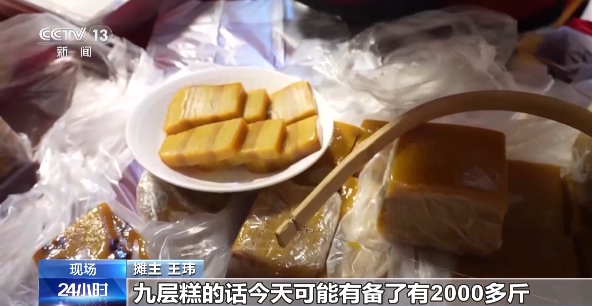 摊主 王玮:九层糕的话今天可能备了有2000多斤,寓意也很好,长长久久、步步高升。