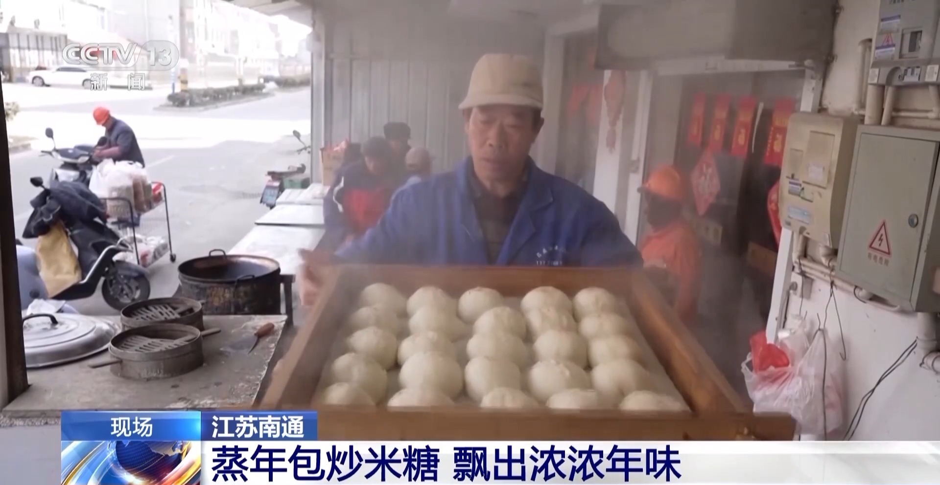 在江苏南通通州区石港古镇,大家蒸年包、炒米糖,寄托“蒸蒸日上 甜甜蜜蜜”的美好寓意。在炒米糖加工作坊里,村民将芝麻、花生、炒米加入熬好的糖稀中,快速搅拌,然后倒入木模,碾平、切割,一块块炒米糖就做好了。