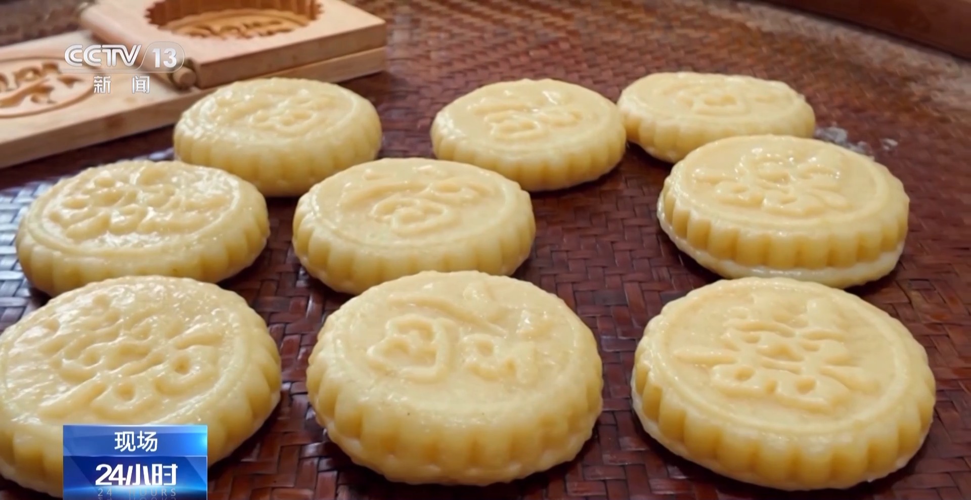 最后,村民们将其搓成饱满的长条,再捏成圆润的饼状,用模具印上代表吉祥的字样。