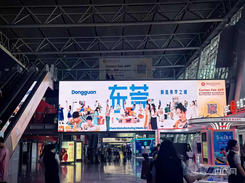 除了企业以“美”为媒,东莞还通过动态视频、静态画面结合的方式,在广交会布局多处核心广告位,展现东莞产品“实用与美学并重”的特色。