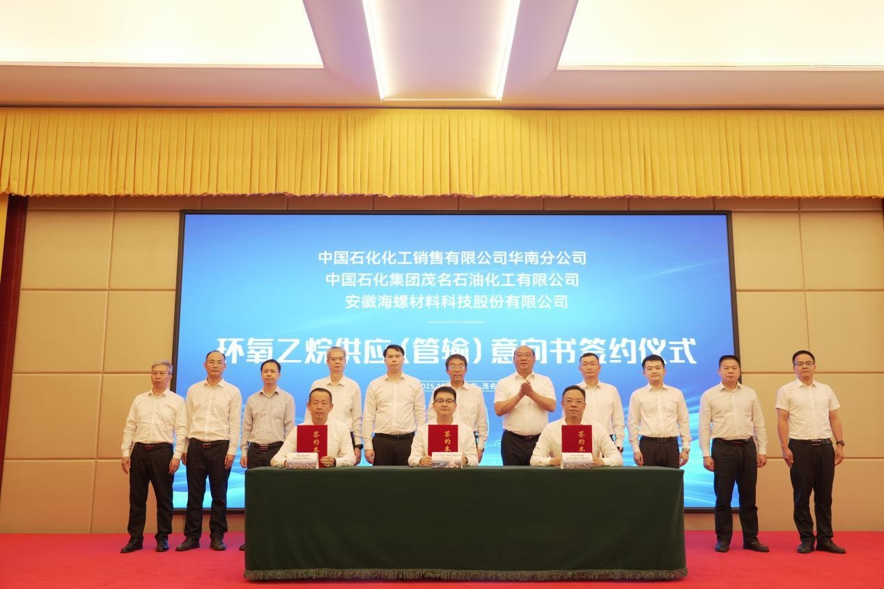 10月14日,安徽海螺材料科技股份有限公司(下称“安徽海螺材料”)环氧衍生物精细化学品项目在茂名高新区正式签约。同时,安徽海螺材料与中国石化化工销售华南分公司、中国石化茂名石化公司共同签署环氧乙烷供应管输意向书,推动茂名绿色石化产业向下游延伸、实现高质量发展的同时,也开拓了茂名高新区与行业领军企业深化合作的崭新局面。