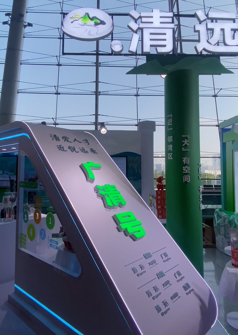 清远展示区域,“广清号”的醒目标志表达着清远招揽各地人才的强烈意愿,来清远发展,大有空间。LED屏、展示板向求职者们展示着近年来清远高质量发展中的地理优势、人文优势、产业优势、旅游优势等。