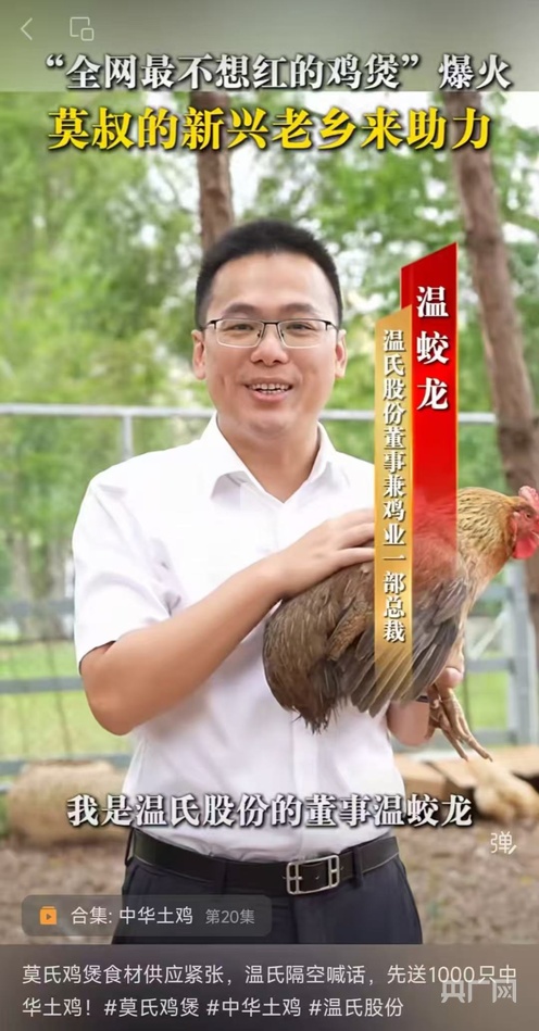 视频中,温蛟龙语气真挚:“莫叔,我也是你新兴本土的老乡,这几天看你那个鸡煲非常火,我作为新兴人,真心为你骄傲。”他表示,莫叔选用温氏中华土鸡,让这一本土食材被更多消费者熟知,“我们温氏上上下下,都感到非常光荣”。针对门店食材短缺的情况,温蛟龙提出:“作为温氏养鸡业的总裁,我先送你1000只鸡,帮你缓解食材压力。”同时,他以老乡之谊邀请莫叔:“多回新兴看看,这里是中华土鸡之乡,有很多优质中华土鸡,咱们一起把家乡的好味道传得更远。”