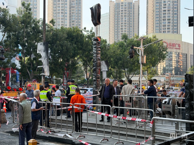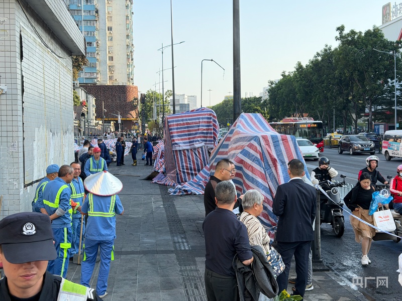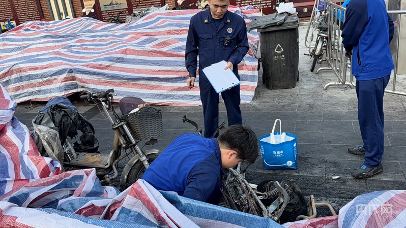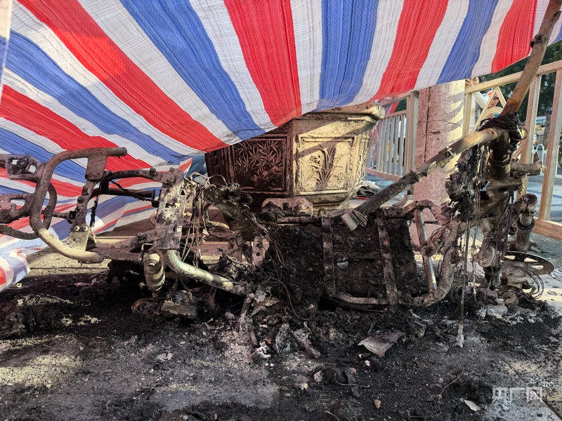 警戒线内,工作人员用大块防雨帆布遮盖火灾痕迹。帆布内,散落着数十辆烧得只剩金属框架的电动自行车,部分车架还残留着焦黑的塑料碎片。距离起火点不远的沙园地铁站C口附近,一处地铁站标识柱已被烧毁并被黑色塑料膜裹住,隐约可见原本的标识轮廓。