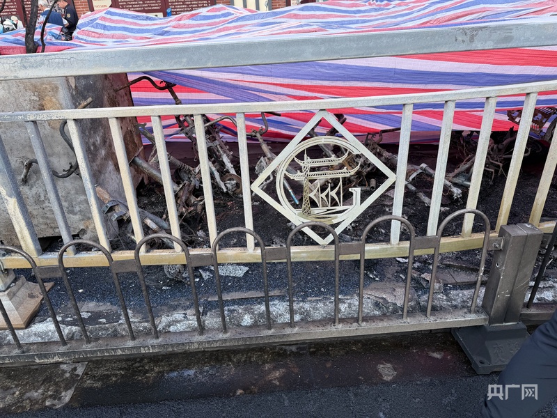 栏杆内被烧毁的电动自行车(央广网记者 官文清 摄)