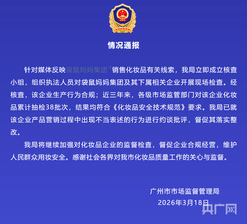 通报显示:经核查,该企业生产行为合规;近三年来,各级市场监管部门对该企业化妆品累计抽检38批次,结果均符合《化妆品安全技术规范》要求。我局已就该企业产品营销过程中出现不当表述的行为进行约谈批评,督促其落实整改。我局将继续加强对化妆品企业的监督检查,督促企业合规经营,维护人民群众用妆安全。感谢社会各界对我市化妆品质量工作的关心与监督。