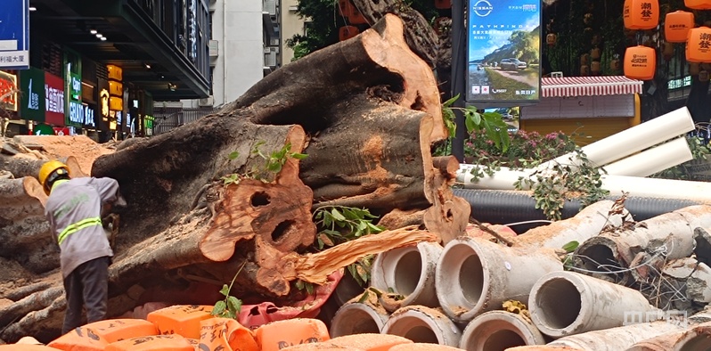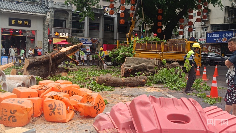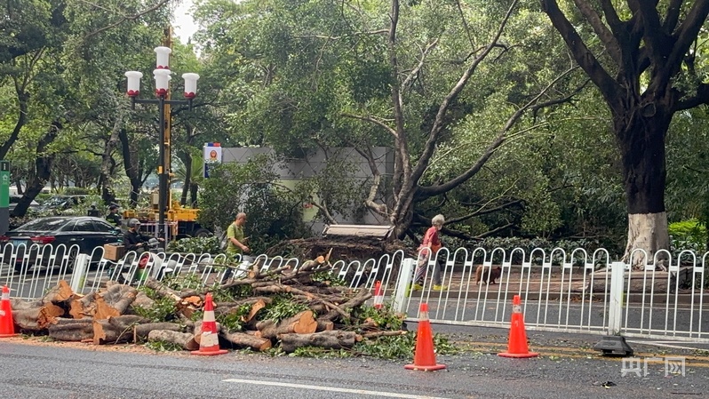 惠福东路上,工人正在清理倒伏树木(央广网发 实习记者雷嘉仪 摄)