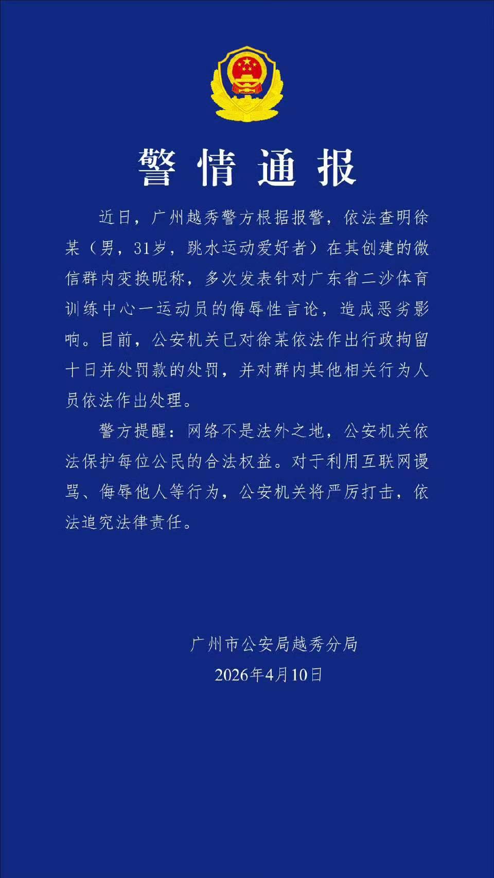 通报显示:近日,广州越秀警方根据报警,依法查明徐某(男,31岁,跳水运动爱好者)在其创建的微信群内变换昵称,多次发表针对广东省二沙体育训练中心一运动员的侮辱性言论,造成恶劣影响。目前,公安机关已对徐某依法作出行政拘留十日并处罚款的处罚,并对群内其他相关行为人员依法作出处理。