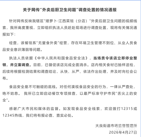 央广网佛山4月27日消息(记者郑少纯)4月27日,佛山市顺德区大良街道市场监督管理所就“矮萝卜·江西菜馆(分店)”外卖后厨卫生问题发布情况通报。