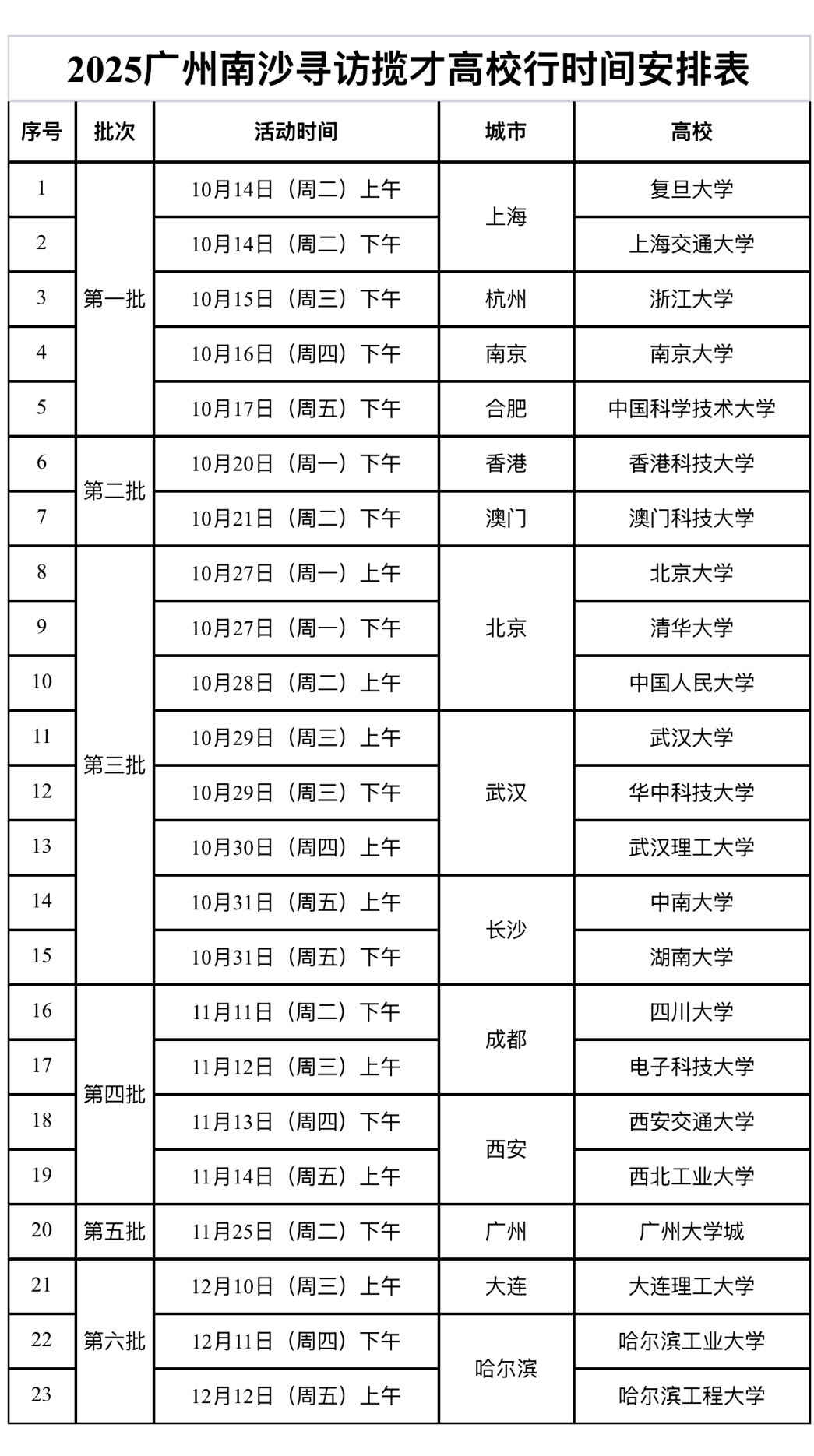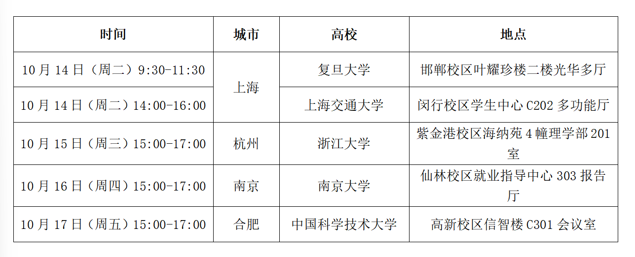 广州南沙“2025寻访揽才高校行”首站将锁定华东地区复旦大学、上海交通大学、浙江大学、南京大学、中国科学技术大学5所顶尖高校,时间地点如下,感兴趣的同学请备好简历准时赴约!