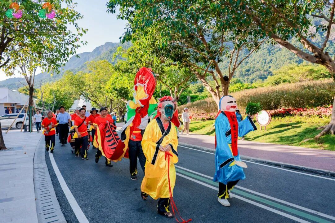 广东省级非遗“舞貔貅”在群山环抱中腾挪起舞,铿锵锣鼓与潺潺流水相和,以充满力量的仪式感迎接火炬,邀请现场观众一同沉浸在喜庆吉祥的氛围里。